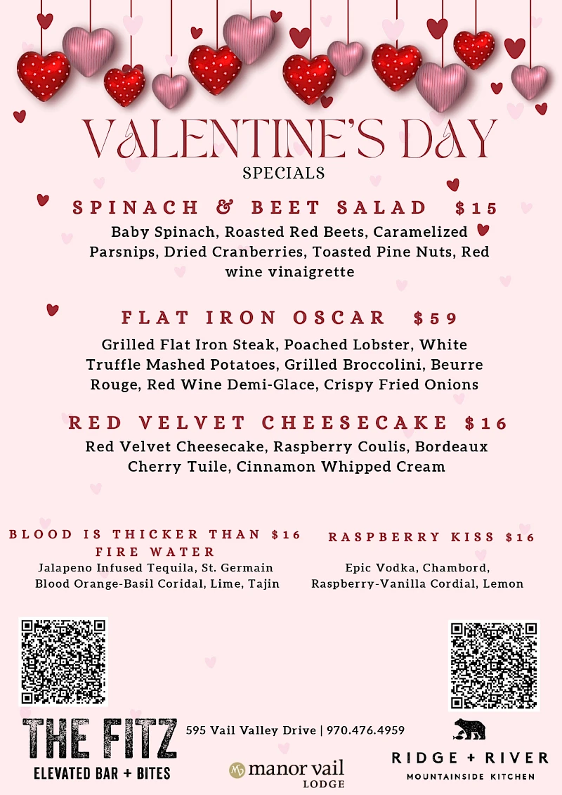 Celebrate Valentine’s Day at The Fitz and Ridge + River with a romantic menu crafted for the occasion. Enjoy the fresh and colorful Spinach & Beet Salad, indulge in the decadent Flat Iron Oscar with poached lobster and truffle mashed potatoes, and finish with a Red Velvet Cheesecake topped with raspberry coulis and cinnamon whipped cream. Pair your evening with handcrafted cocktails like the spicy-sweet Blood Is Thicker Than Fire Water or the luscious Raspberry Kiss. Available at 595 Vail Valley Drive inside Manor Vail Lodge.